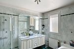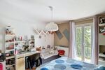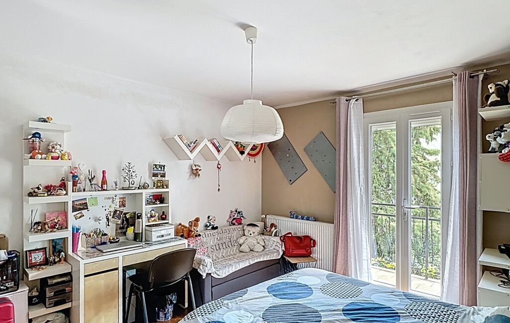À l’étage, l’espace nuit se compose de deux chambres de 14 et 15 m², dont une avec un balcon, ainsi qu’une pièce de 8 m² pouvant faire office de chambre d’enfant ou de bureau. Une salle de cinéma de 20 m² complète ce niveau, offrant un espace polyvalent pouvant également être aménagé en chambres supplémentaires, bureau ou en salle de jeux. Une salle de bain avec baignoire et douche ainsi qu’une double vasque et un WC indépendant y sont également présents.