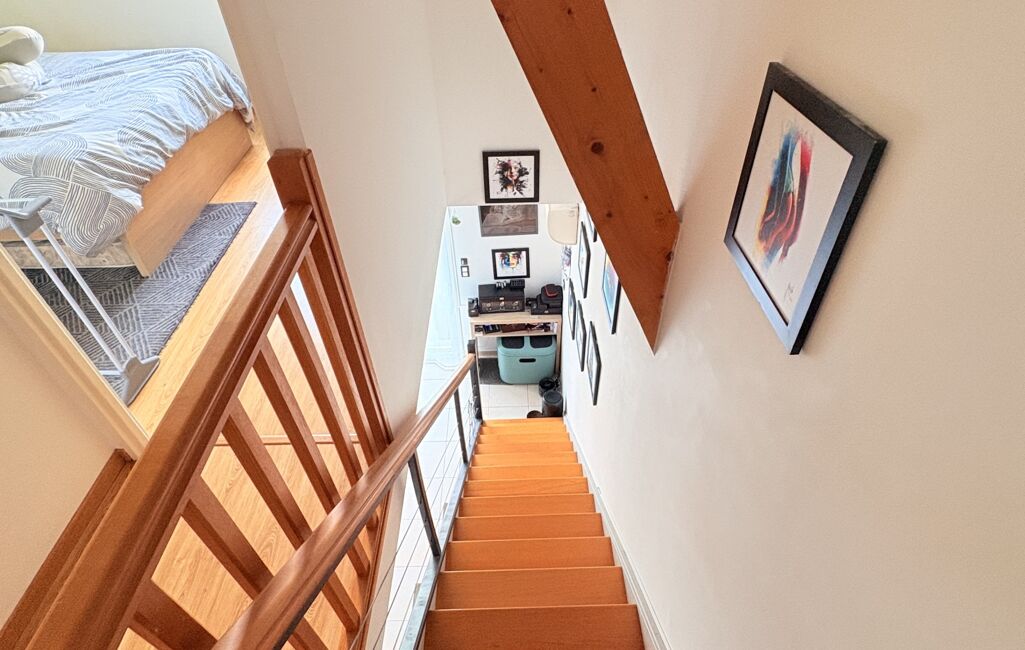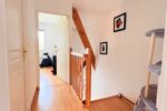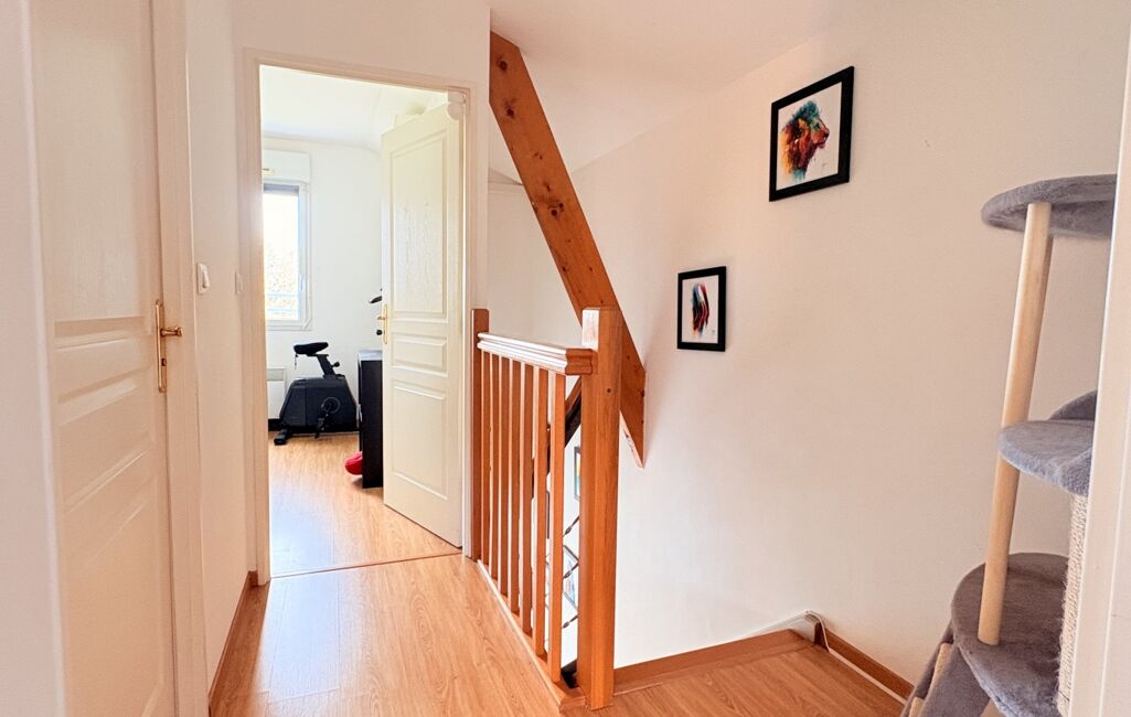L’étage propose un pallier donnant sur deux chambres avec placard sur mesure et rangements. Une salle de bain avec toilettes.