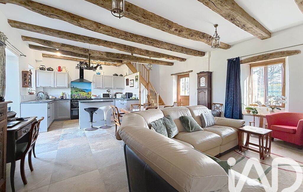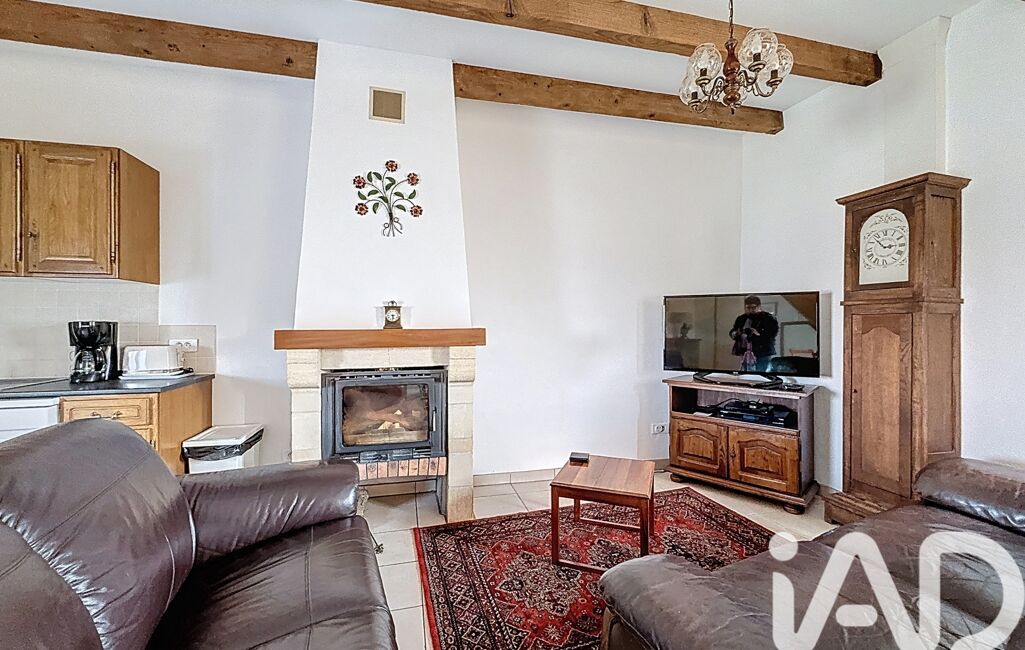 Salon / séjour avec cheminée insert et cuisine ouverte.