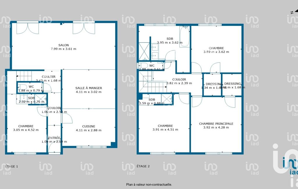Le premier étage se compose de 3 chambres, dont 1 avec sa salle d'eau, 1 grande salle de bain (douche et baignoire), et des toilettes.
