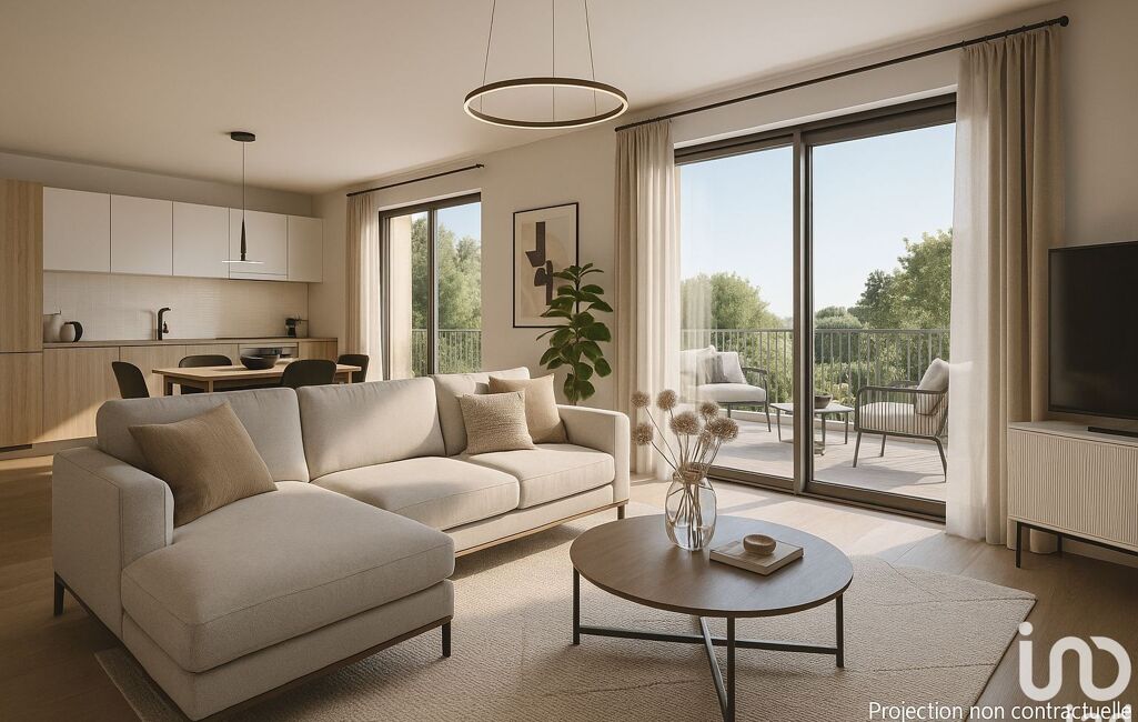 Une pièce de vie de 29,5 m² environ avec cuisine ouverte et accès balcon