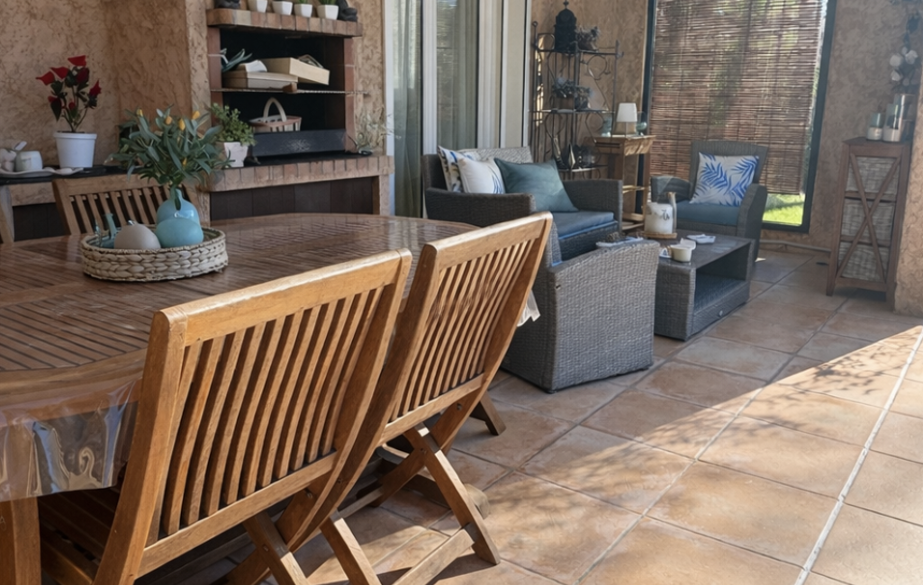 •Une terrasse face à la piscine, idéale pour les repas et moments de détente