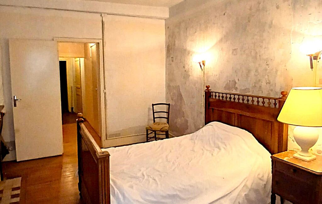 - 1 Chambre de 15 m² environ, parquet, murs bruts, 1 placard, 1 cheminée décorative, 1 fenêtre en PVC blanc en double vitrage et volets bois,