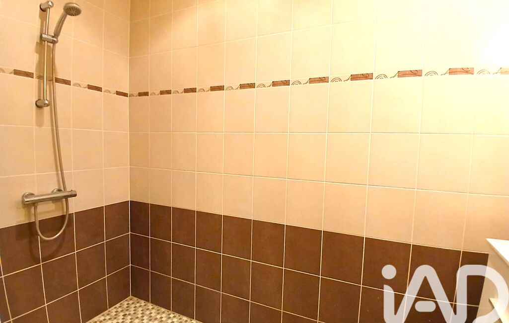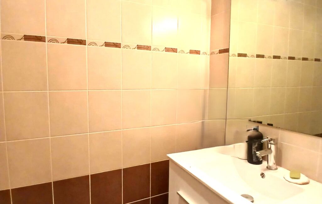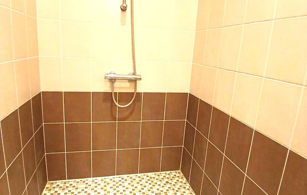 - 1 Salle d'eau avec 1 douche à l'italienne, 1 meuble avec tiroirs et vasque simple + miroir, 1 radiateur soufflant, 1 petite fenêtre en PVC blanc en double vitrage, 1 VMC électrique