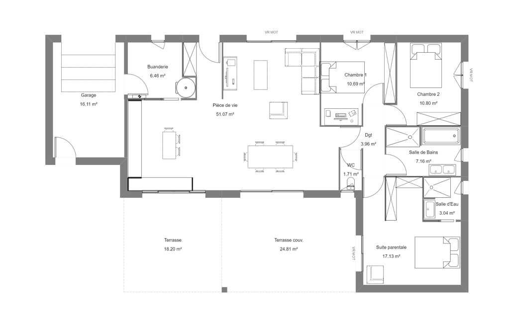 Terrain + maison, prix à partir de 237 600 euros - Garantie d'achèvement et de livraison à prix et délais convenus incluse - DO incluse - Adaptation au sol inclus - Visuel non contractuel - Non mandaté pour la vente de ce terrain.