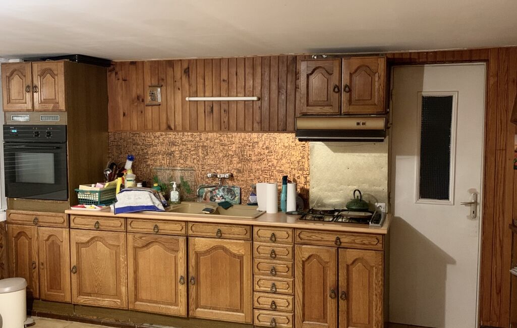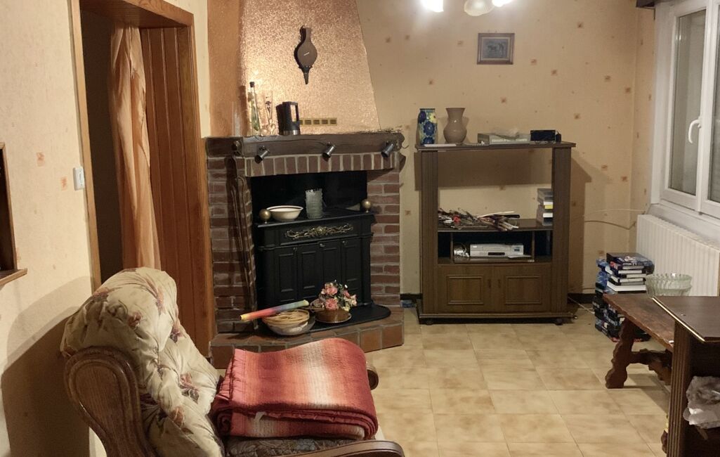Cette habitation érigée sur une parcelle de 840 m 2 située dans un village calme est composée : D'un hall d'entrée, d'une cuisine équipée de 22m 2, d'une salle d'eau à rénover, d'un salon de 19 m2, d'un séjour de 12 m 2 avec cheminée feu de bois.