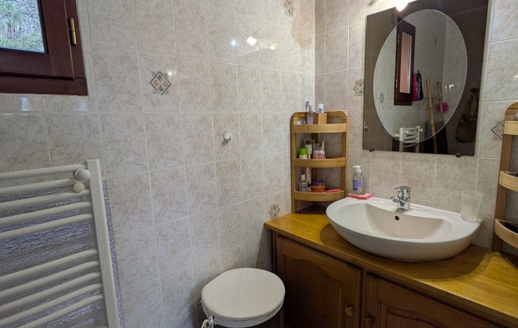 A l'étage : deux chambres de 13 et 10 m2, un espace couchage de 9 m2 en surface plancher et des toilettes séparées avec lave-main.
