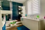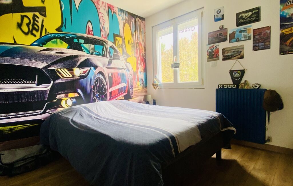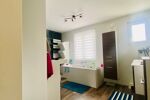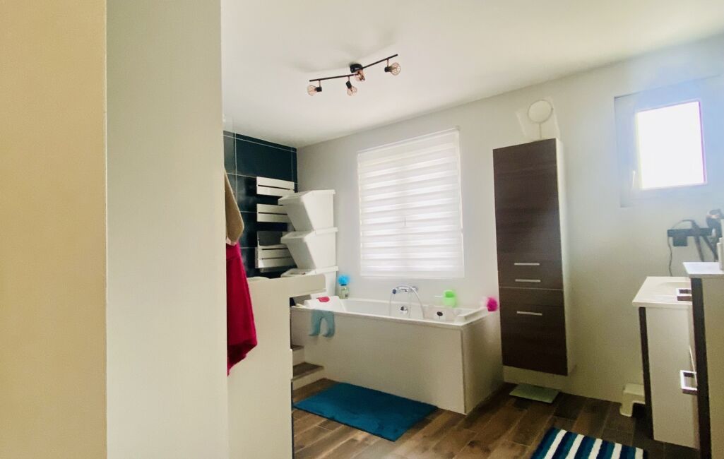 À l’étage, le palier dessert trois chambres d’environ 9,5 à 10 m², dont une suite parentale de 15 m² avec un grand dressing, ainsi qu’une salle de bain complète équipée d’une douche à l’italienne, d’une baignoire, d’une simple vasque et d’un WC.