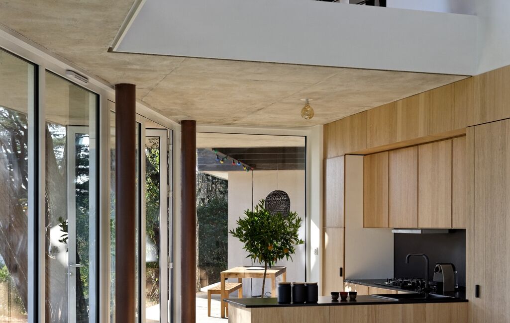 La maison principale de 148m2, sur 2 niveaux, présente au rdc entièrement vitré, une vaste pièce de vie sous un puits de lumière, une cuisine ouverte et un double salon autour d'un poêle Focus. Une buanderie et un wc sont dissimulés derrière une porte en bois intégrée aux placards. L'étage vous accueille sur une vaste mezzanine offrant un espace bureau et bibliothèque, tout en profitant d'une sensation dans les arbres et d'une vue sur le golfe à l'horizon. Une suite parentale (avec sa salle d'eau privative), 2 chambres dont une avec vue mer, une salle de bains et un wc complètent ce niveau.