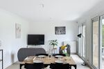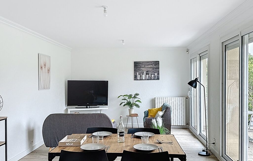 Dès l'entrée, vous accédez à un séjour lumineux ouvrant sur un grand balcon. Ce niveau regroupe également une salle d'eau, un WC indépendant, deux chambres et un bureau, compris entre 9 et 10 m².