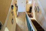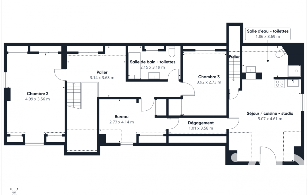 À l’étage, une mezzanine dessert deux chambres, un bureau, une salle de bain et un second WC, créant un espace nuit bien distinct.