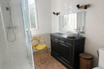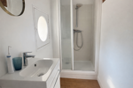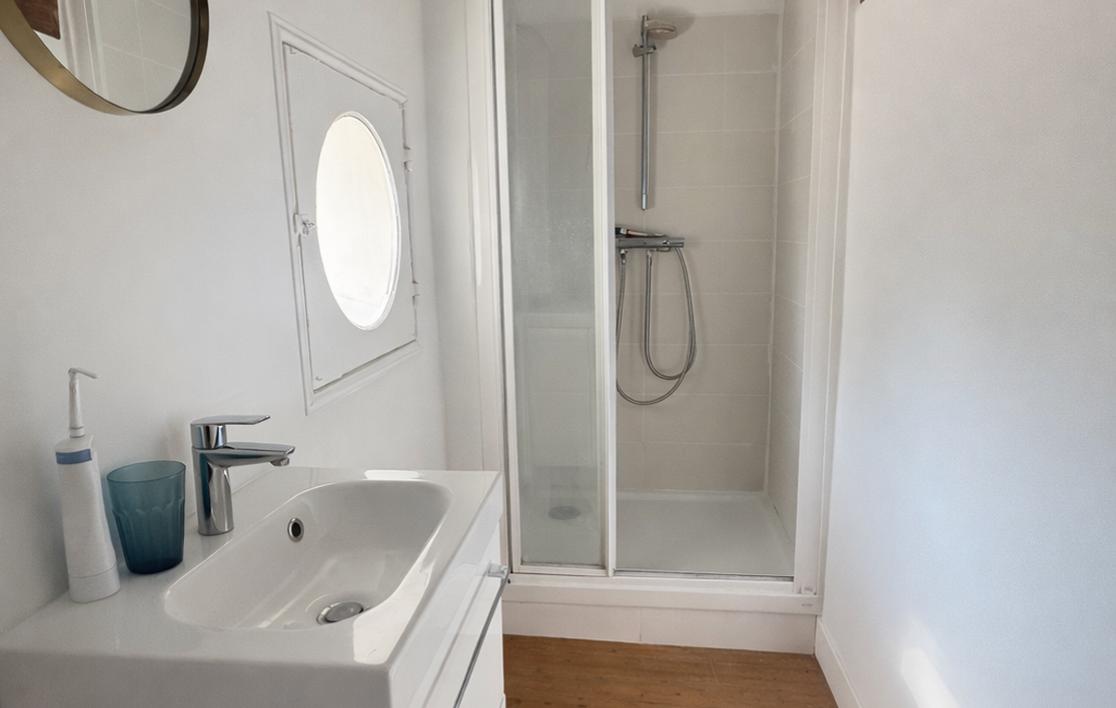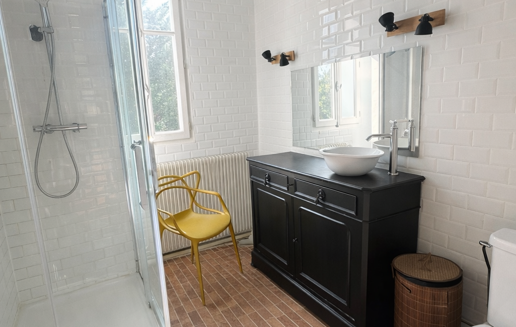 Salle d'eau élégante avec grande douche et wc.