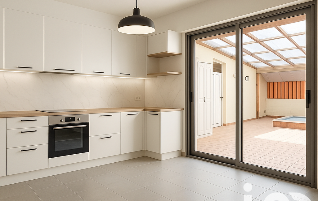 Le rez-de-chaussée se compose d’une belle entrée desservant un vaste salon baigné de lumière grâce à de grandes baies vitrées, ouvrant sur la terrasse et sa piscine entièrement couverte. Vous trouverez également une cuisine indépendante, donnant elle aussi accès à l’extérieur.