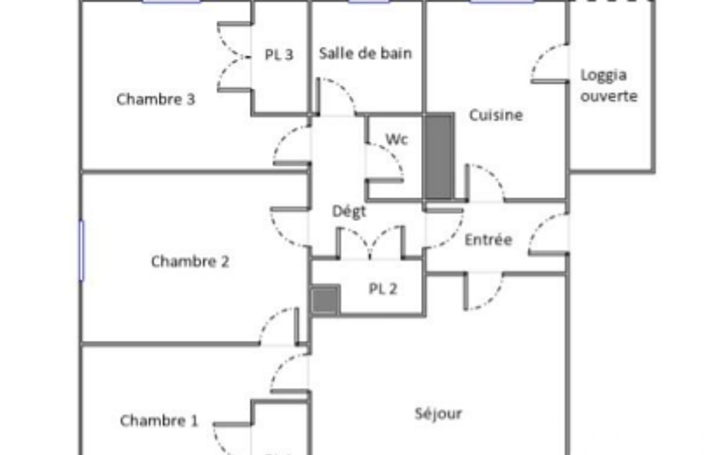 L'entrée dessert à droite une cuisine avec loggia, à gauche l'espace salon et en face le coin nuit avec 3 chambres, placards, une salle de bain et des WC séparés.