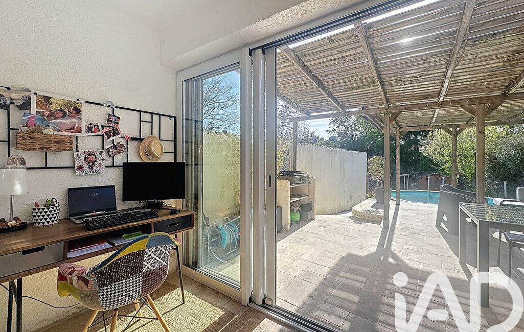 Le séjour s’ouvre sur une agréable terrasse en travertin, parfaitement aménagée, avec une piscine hors-sol, créant un véritable espace de détente à l’abri des regards.