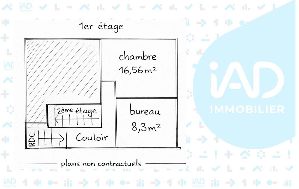 Au premier étage : une chambre de 16,50 m² environ avec balcon ainsi qu’un bureau ou coin nuit de 8,30 m² environ.