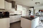 Dès l'entrée, vous serez séduit par la luminosité des volumes, notamment grâce à un vaste espace de vie traversant. Cette pièce principale assure un confort thermique optimal en toutes saisons grâce à son chauffage au sol, sa cheminée avec insert pour une ambiance chaleureuse, ainsi qu'une pompe à chaleur (PAC) avec split. La cuisine moderne, équipée d'un îlot central convivial, est idéalement secondée par une buanderie attenante très fonctionnelle qui simplifie le quotidien. L'ensemble s'ouvre naturellement sur une grande terrasse carrelée, parfaite pour les déjeuners en plein air.