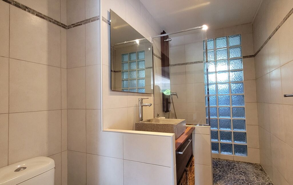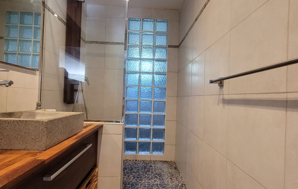 À l'intérieur, vous trouverez un espace de vie comprenant un salon et une cuisine équipée, 2 chambres climatisées dont 1 chambre parentale avec sa salle d'eau, 1 salle d'eau avec WC et