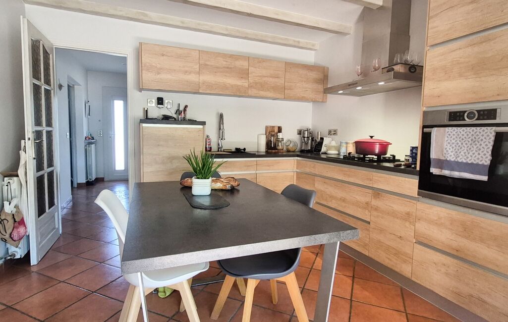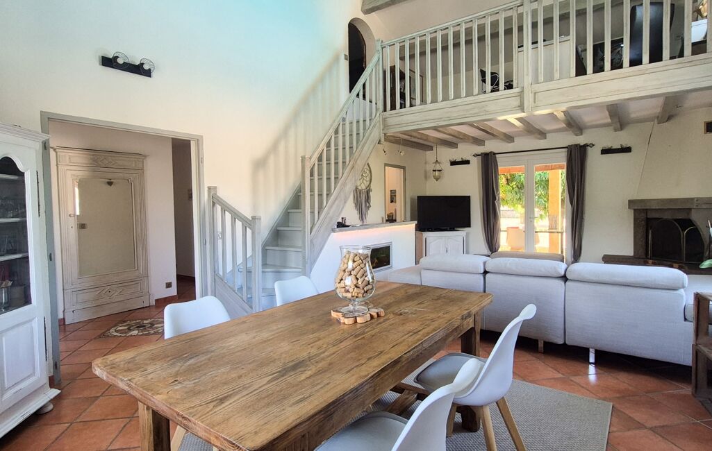 L'entrée vous mène vers un vaste espace de vie baigné de lumière au plafond cathédrale composé d'une salle à manger, d'un séjour avec cheminée et d'une cuisine équipée, l'ensemble s'ouvrant sur une terrasse couverte sans vis à vis.