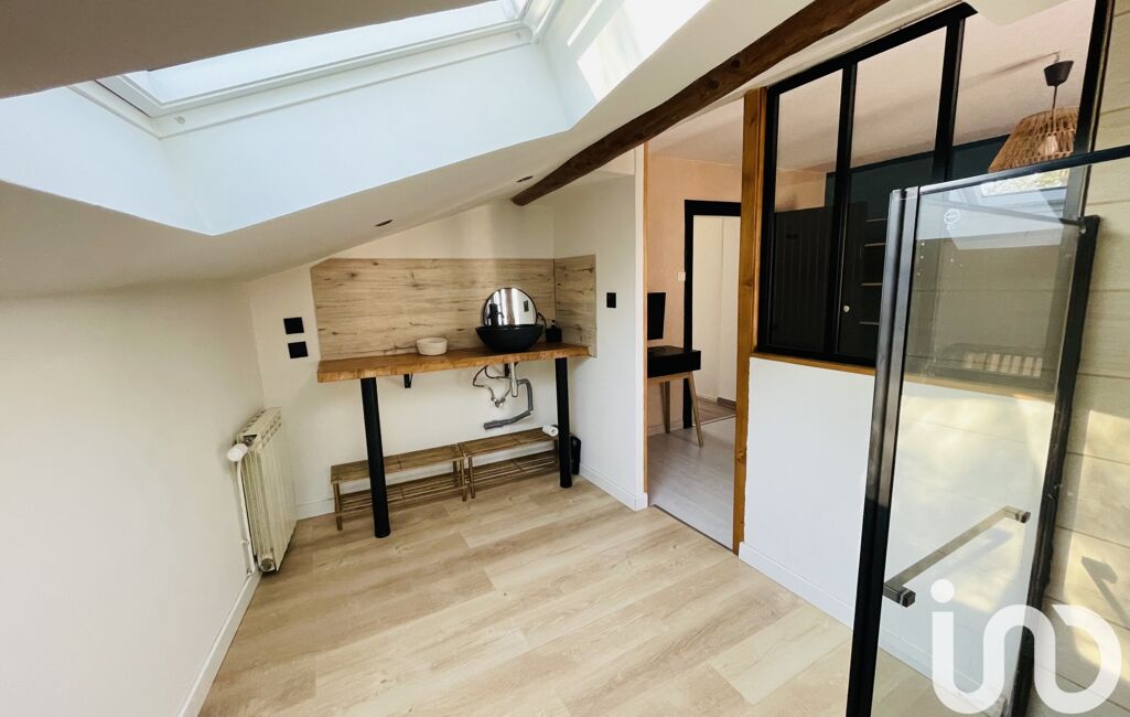 À l’étage : une chambre ouverte sur salle d’eau, WC séparé, et un espace bureau ou coin nuit (env. 8 m²).
