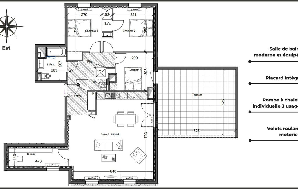 Dès l’entrée, vous serez séduit par un beau séjour avec cuisine ouverte de 42 m² environ qui se prolonge par une large terrasse de 33 m² environ. Le coin nuit est idéalement agencé avec trois chambres confortables, dont une suite parentale avec sa salle d'eau. Un bureau complète cet espace de vie, idéal pour télétravailler. L’appartement comprend également une salle de bains moderne équipée et des WC séparés.