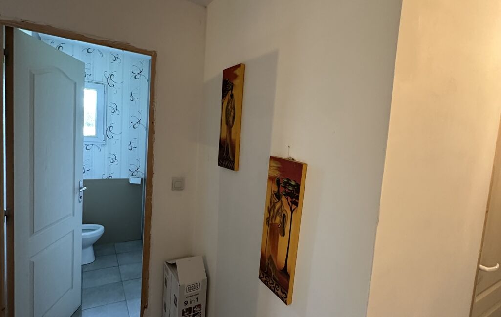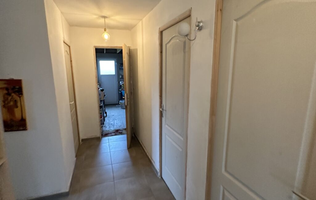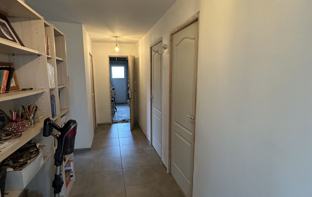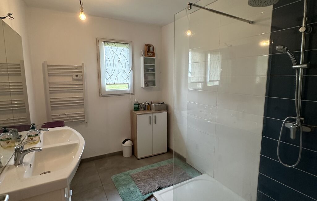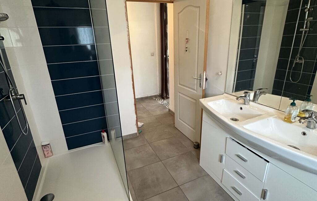La partie nuit dessert trois chambres, une salle d’eau équipée d’une douche et d’une double vasque, ainsi qu’une buanderie fonctionnelle.