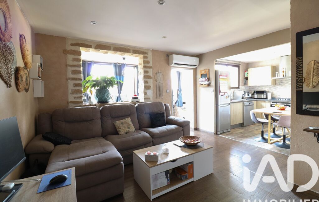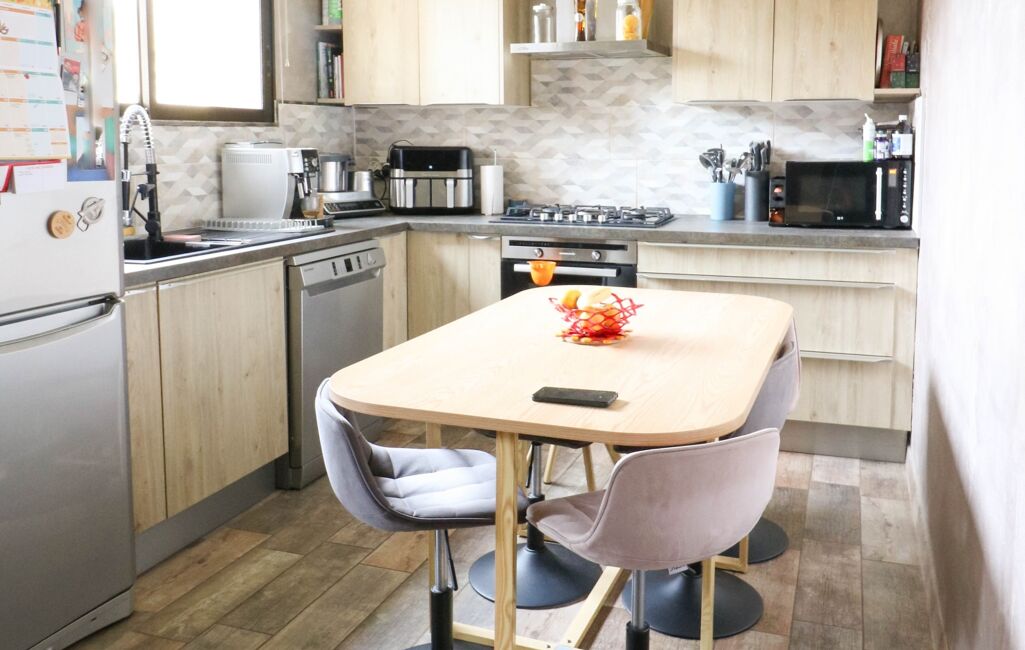 L’accès se fait par une entrée commune, puis l’on découvre une entrée chaleureuse avec parquet, qui mène vers un séjour lumineux et climatisé. La cuisine ouverte, moderne, équipée et récente, s’intègre parfaitement à la pièce de vie.
