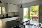La cuisine indépendante, élégamment structurée par une verrière sur mesure, s’intègre avec harmonie à l’ensemble et se prolonge vers une terrasse idéale pour les repas en extérieur.
