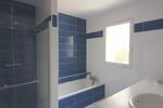 La salle de bain est spacieuse et moderne, avec double vasque, baignoire et douche à l’italienne, complétée par deux WC séparés.