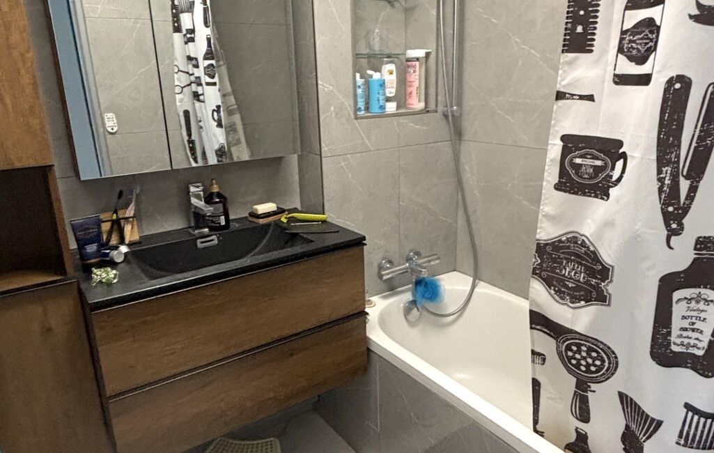 Une grande entrée avec de nombreux placards de rangements, une cuisine équipée et aménagée ouverte sur un salon avec un accès sur un beau balcon (d'environ 10m2) accessible par de grandes baies vitrées en aluminium, 1 chambre avec placard, 1 salle de bains avec vasque, 1 WC indépendant.