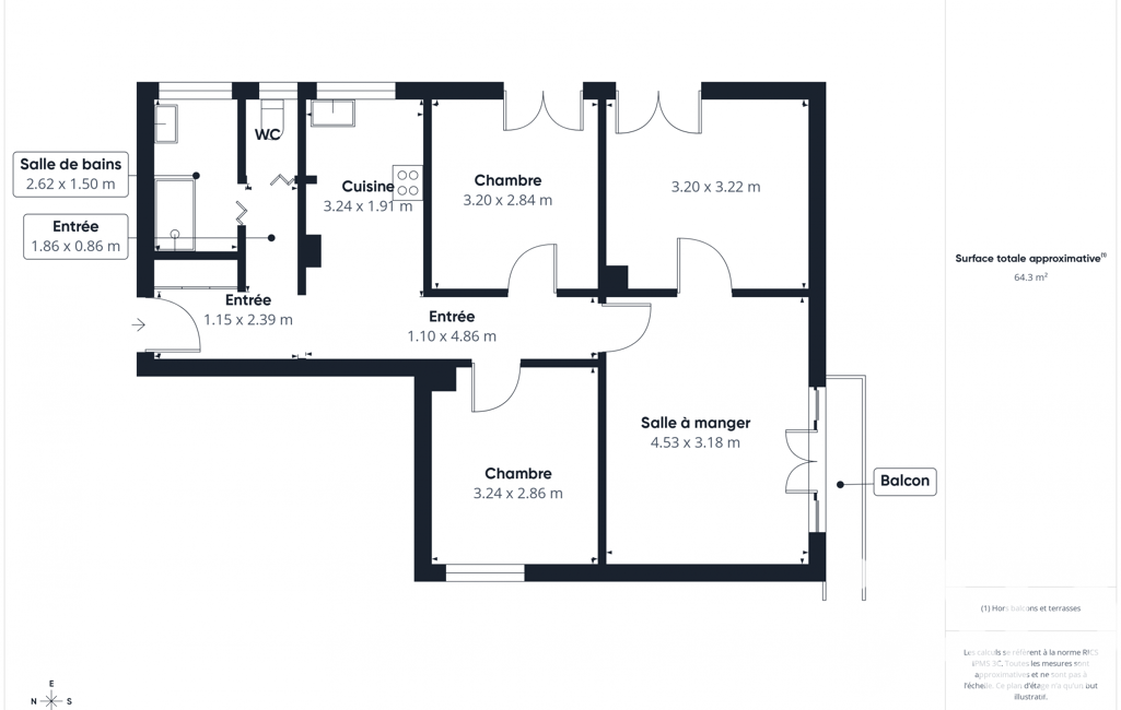 - Surface habitable : 64 m²