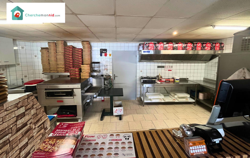 Au rez-de-chaussée, un local commercial de 70 m², entièrement équipé, actuellement loué à une pizzeria avec bail 3/6/9 ans jusqu’en 2034, loyer 560euros/mois.