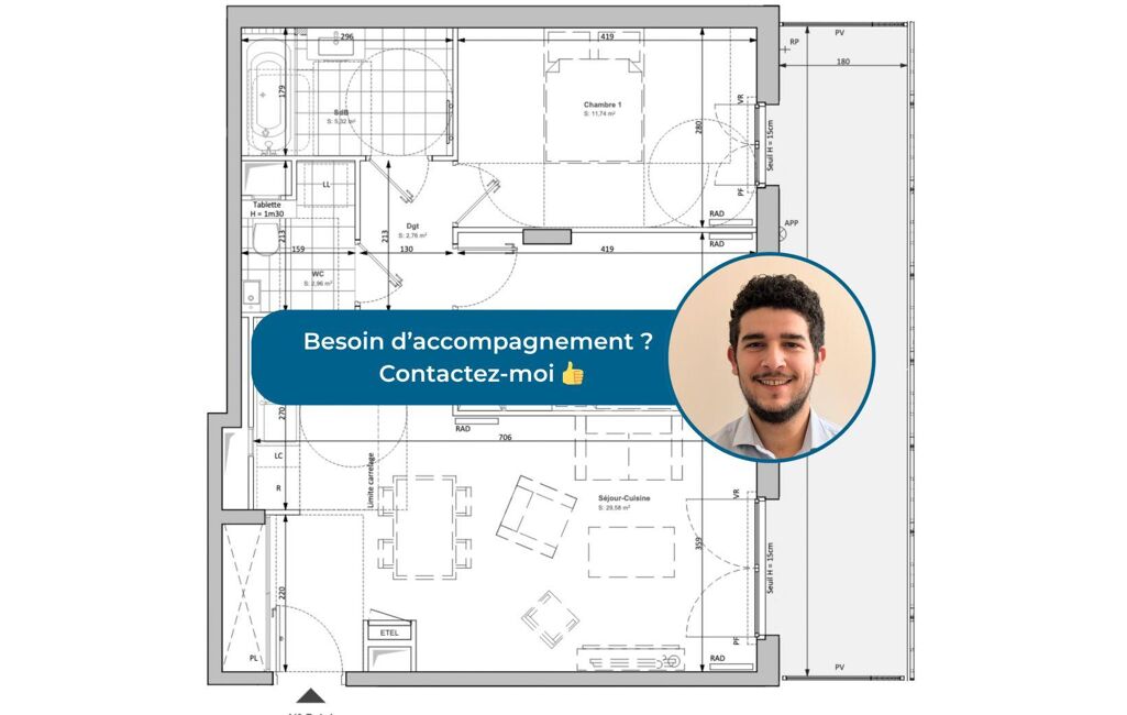 L’appartement présenté est un T3 de 62,69 m² environ habitables, situé au premier étage. Il se compose d’un séjour-cuisine spacieux de 29,58 m² environ, d’une chambre principale de 11,74 m² environ, d’une seconde chambre de 10,33 m² environ, d’une salle de bains de 5,32 m² environ, d’un WC séparé de 2,96 m² environ et d’un dégagement de 2,76 m² environ. Une superbe terrasse de 16,36 m² environ complète ce bien, offrant un véritable prolongement extérieur pour profiter du calme et de la luminosité du quartier. L’agencement optimisé et les volumes généreux garantissent un confort de vie idéal au quotidien.