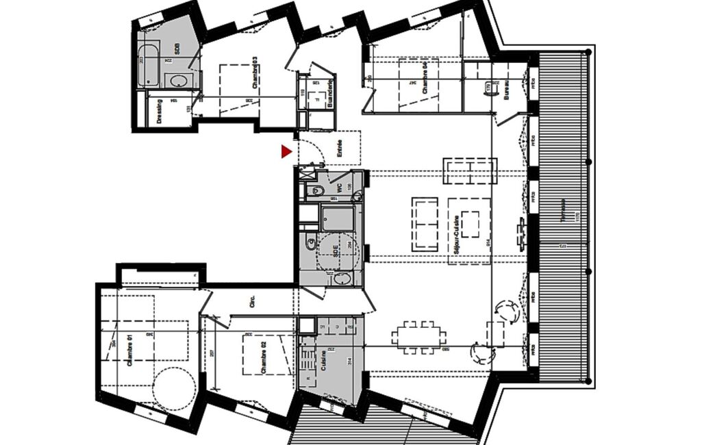 Situé au 5 ème étage, cet appartement T5 de 149 m² environ habitables se prolonge par deux terrasses de 26 et de 20 m² environ.