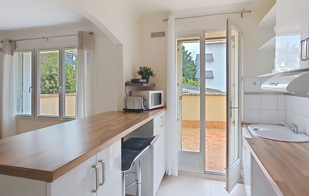 Prestations de qualité : Appartement en très bon état. Cuisine semi-ouverte avec accès direct à la terrasse, salle d'eau moderne (douche, sèche-serviettes) et nombreux rangements.
