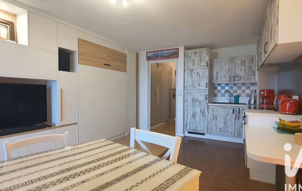 Ce studio, situé au 1er étage d'une résidence de 2 étages d'une superficie de 29m2, offre un espace de vie bien agencé et optimisé. La pièce principale, comprenant la cuisine ouverte sur le séjour, bénéficie d'une belle luminosité avec son exposition plein Sud. Un aménagement sur-mesure comprenant un lit escamotable avec bibliothèque et meuble TV vous permet de profiter pleinement du séjour en journée et de la partie nuit en soirée. Le balcon privé sans vis-à-vis est parfait pour profiter d'un moment de détente en plein air avec sa vue mer avec la possibilité à termes de réaliser une véranda fermée pouvant ainsi augmenter la surface habitable.