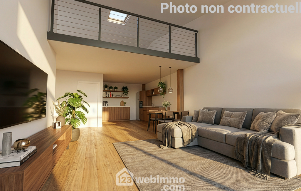L'appartement se compose au rez-de-chaussée : d'un salon/séjour, une cuisine aménagée équipée (hors réfrigérateur), une salle d'eau avec wc et à l'étage : une chambre en mezzanine. En extérieur : une terrasse/cour privative d'environ 10 m² et sa place de stationnement.