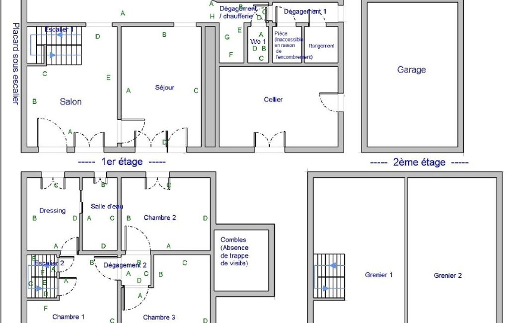 Développant environ 73,38 m² habitables sur trois niveaux, elle se compose au rez-de-chaussée d’une entrée sur salon, d’une salle à manger (avec possibilité d’ouverture entre les deux espaces), d’une cuisine aménagée, d’un WC, d’un espace chaufferie / buanderie ainsi que d’un accès à l’extérieur menant au cellier et au garage.