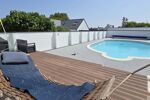 •Terrasse en lame pleine de bois composite, partiellement couverte par une pergola équipée de brise-vent et toiture à fermeture électrique avec télécommandes.