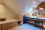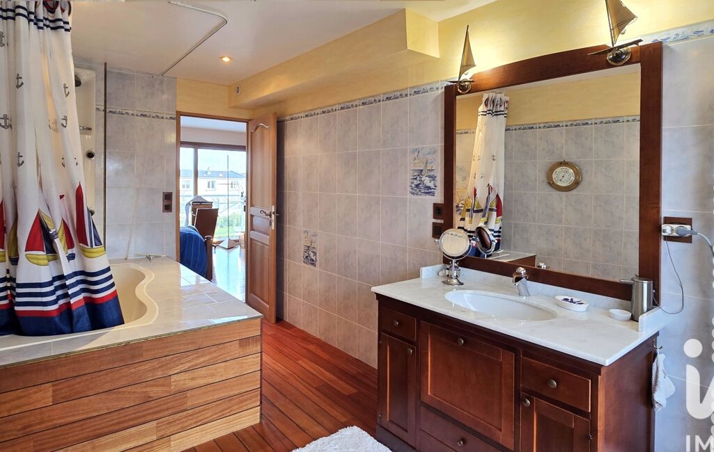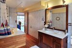 •Salle de bain attenante, équipée d’une large fenêtre oscillo-battante à double vitrage doublée en bois exotique d’iroko, sur un véritable 'pont de bateau'. Les éclairages en barre à roue et planche à voile finissent le décor.