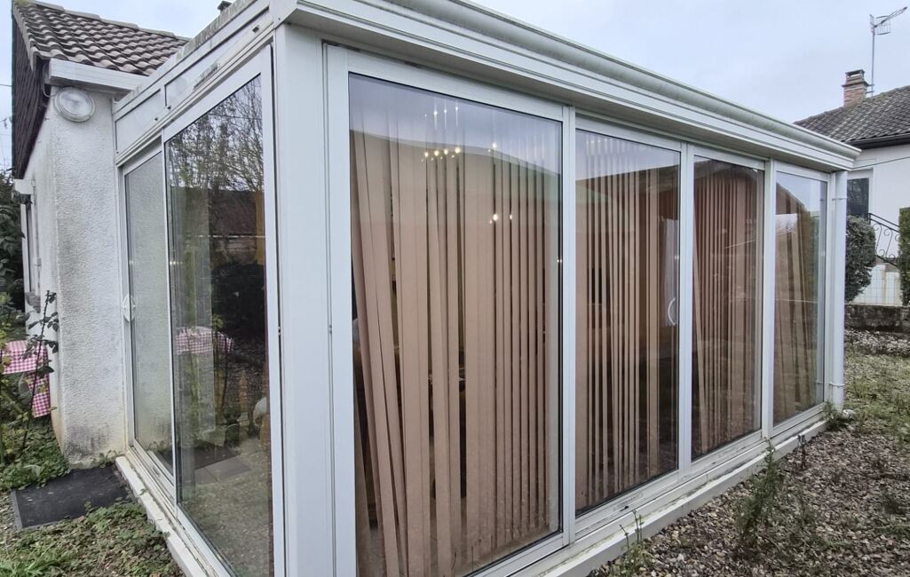 Une belle véranda faisant office de séjour, lumineuse et confortable, équipée d’une pompe à chaleur réversible.