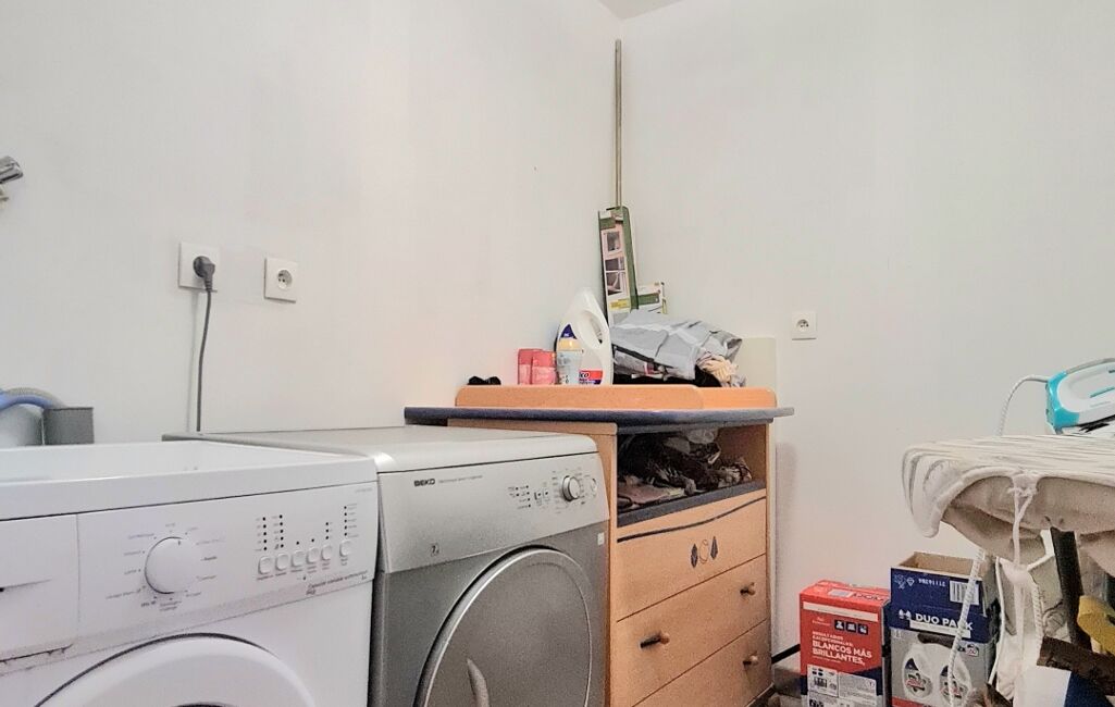 une pièce de 15m² servant de rangement et stockage ainsi que la pièce de vie traversante et lumineuse composée d'un salon, d'une salle à manger et de la cuisine équipée.