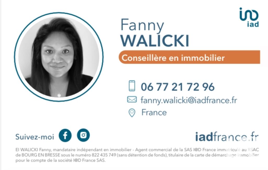 La présente annonce immobilière a été rédigée sous la responsabilité éditoriale de Mme Fanny Walicki mandataire indépendant en immobilier (sans détention de fonds), agent commercial de la SAS I@D France immatriculé au RSAC de BOURG EN BRESSE sous le numéro 822435749, titulaire de la carte de démarchage immobilier pour le compte de la société I@D France SAS.