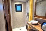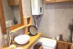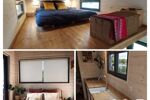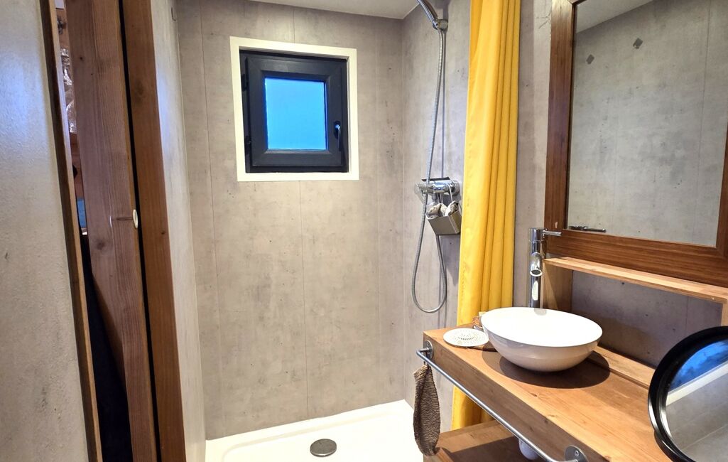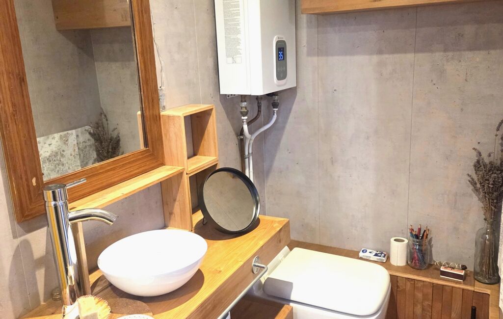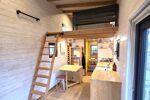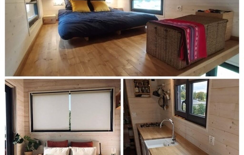 Les équipements de la Tiny: Chauffage électrique, Chauffe-eau gaz instantané, WC broyeur, VMC, Cuisine équipée, Raccordée eau, électricité et tout à l’égout.
