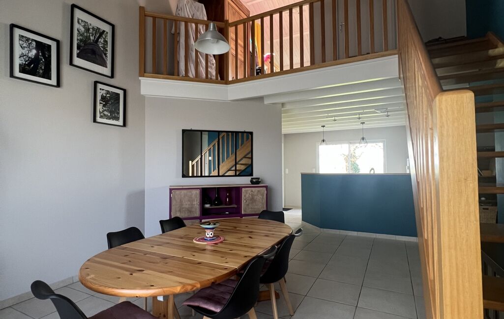 Une mezzanine surplombant la salle à manger offre un lieu propice à la détente ou au travail.