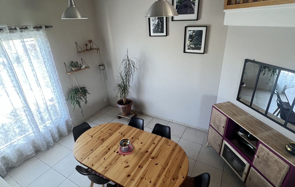 L'entrée élégante vous accueille chaleureusement et introduit l'atmosphère conviviale de cette propriété avec un bel espace de salle à manger donnant sur un salon. Une cuisine aménagée et semi équipée fonctionnelle, idéal pour concocter de délicieux repas en famille ou entre amis.
