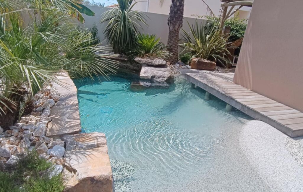 Une magnifique piscine lagon, une paillote exotique et une pergola en bambou avec brasero créent une atmosphère unique, digne des plus belles villas de Bali.