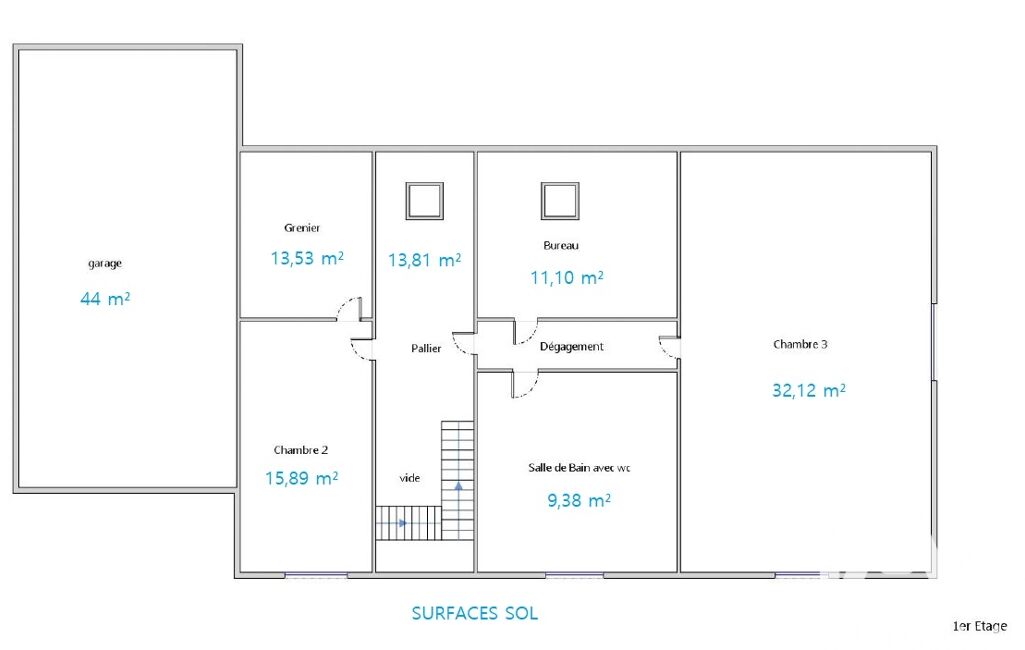 Le rez-de-chaussée se compose d’un très vaste séjour lumineux, d’une cuisine séparée, d’une chambre parentale avec salle de bain, ainsi que de toilettes indépendantes. À l’étage, une grande pièce palière dessert une chambre, un bureau, et une seconde suite parentale équipée d’une salle de bain et de WC. Un grenier complète cet espace nuit, offrant un potentiel de rangement supplémentaire.