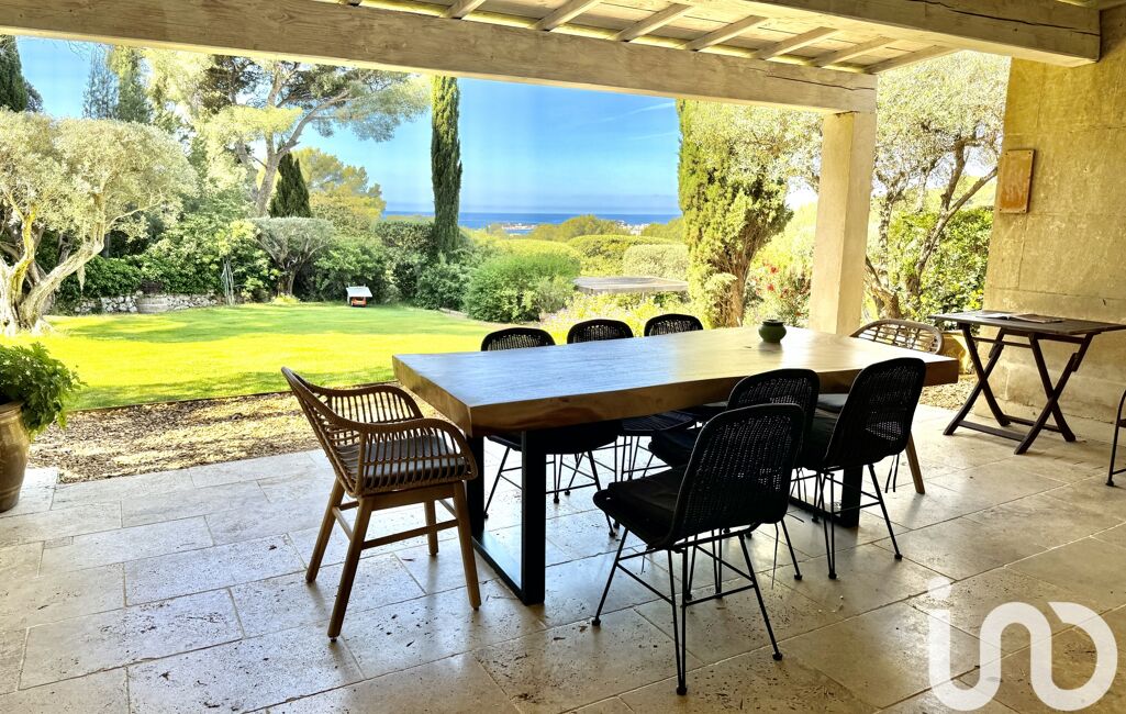 La maison s'ouvre sur un jardin arboré sans vis-à-vis avec une magnifique vue mer sur la baie de Bandol offrant un espace extérieur propice à la détente et aux loisirs.