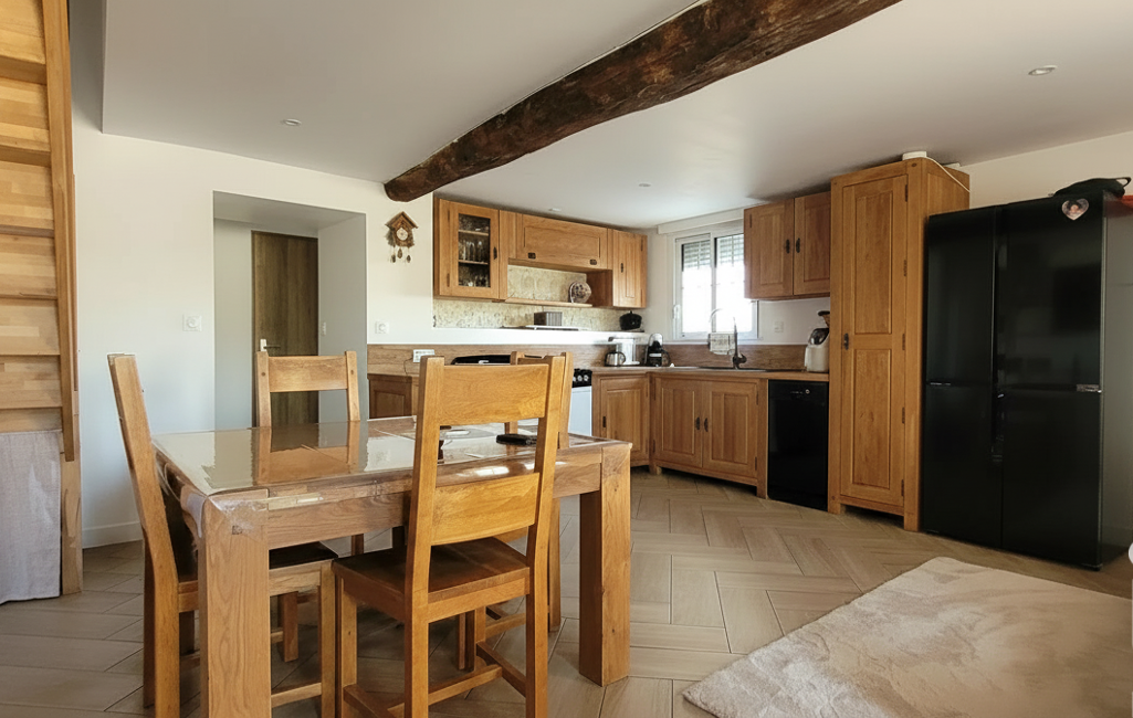 La cuisine équipée, bien agencée, constitue un véritable atout avec des espaces de rangement optimisés et des plans de travail fonctionnels.
